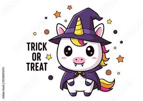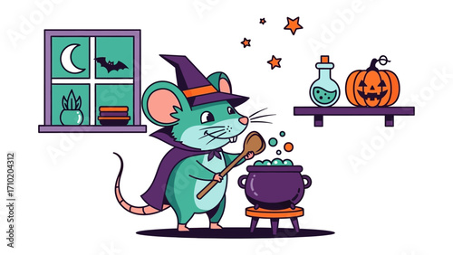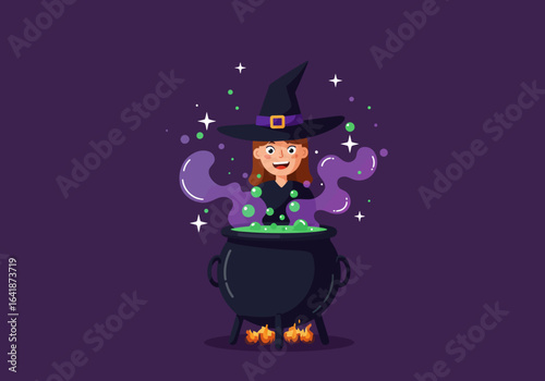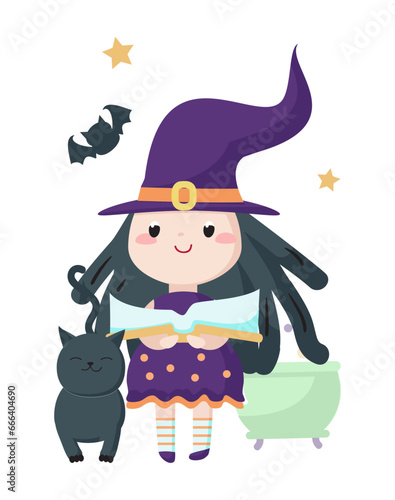 Cute little witch brewing potion in cauldron and reading spell vector illustration. Witchery and sorcery concept. Happy Halloween greeting card design template