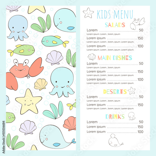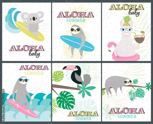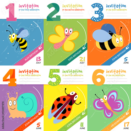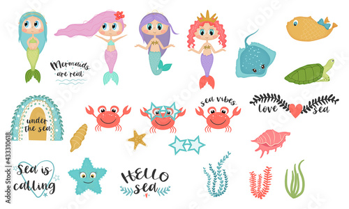Cute mermaid greeting, invitation cards vector template set. Summer cards with beautiful girls mermaids swimming under sea with dolphin, crab, jellyfish, starfish, fish, turtle and handwritten text.