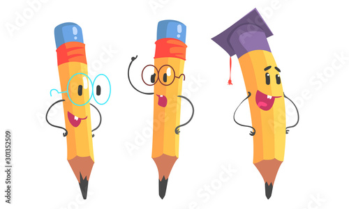 Cute pencil character school supply isolated vector set. Funny emoji with different emotion. Funny cartoon pen writing, having question and looking at alarm clock illustration