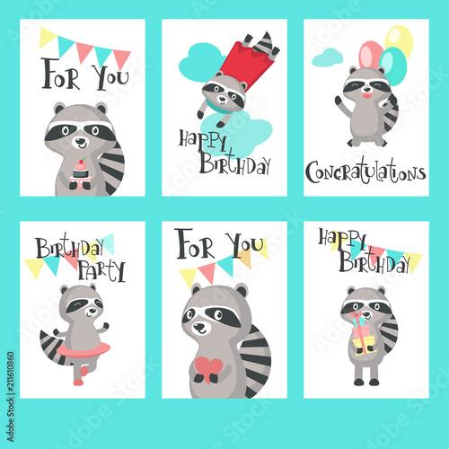 Cute raccoon cards. Vector template set with funny raccoons holding cake, microphone, hearts, cup of coffee and Keep calm, Sweet dreams, Have a nice day, For you, Hello, Wake up calligraphy text.