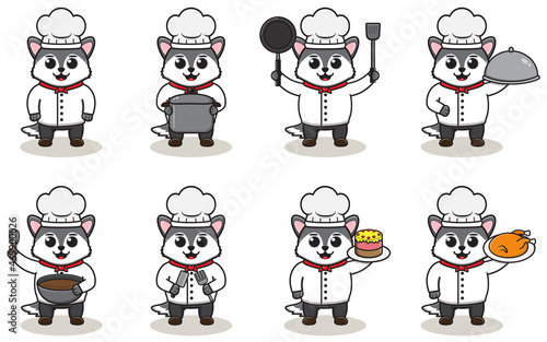 Cute raccoon icon set for greeting card, invitation, poster, sticker, print. Vector isolated illustration of funny raccoons with hearts, cake, coffee, popcorn, 3-d glasses, microphone and headphones.