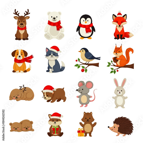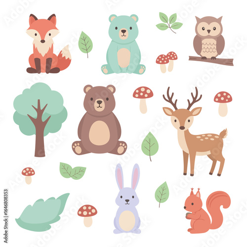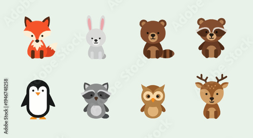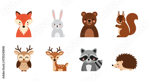 Cute animals with food and drink icon set. Vector illustration of funny hedgehog fox bear squirrel owl raccoon rabbit deer and panda eating their favourite food isolated on white background.