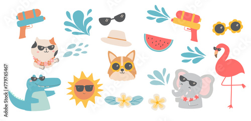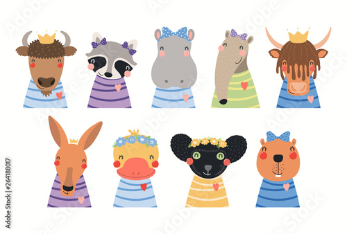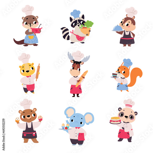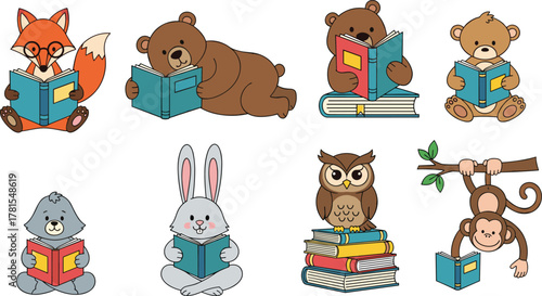 Cute wild animals with books icon set. Vector illustration of funny hedgehog fox bear squirrel owl raccoon rabbit deer and panda reading books isolated on white background.