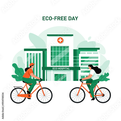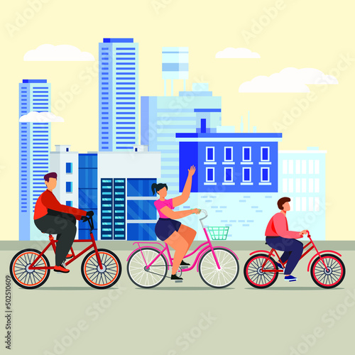 Vector illustration of two cyclists riding on bikes in the city. Sports equipment, helmet, gloves, glasses, sneakers and bicycles. City landscape. Flat design