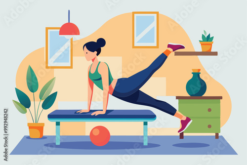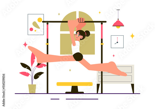 Daily life. Young woman doing yoga exercises, flat vector illustration. Daily routine, everyday activities. Sport, fitness online. Home yoga. Active and healthy lifestyle.