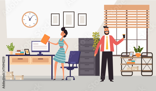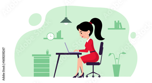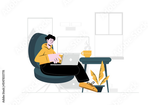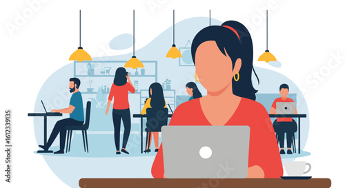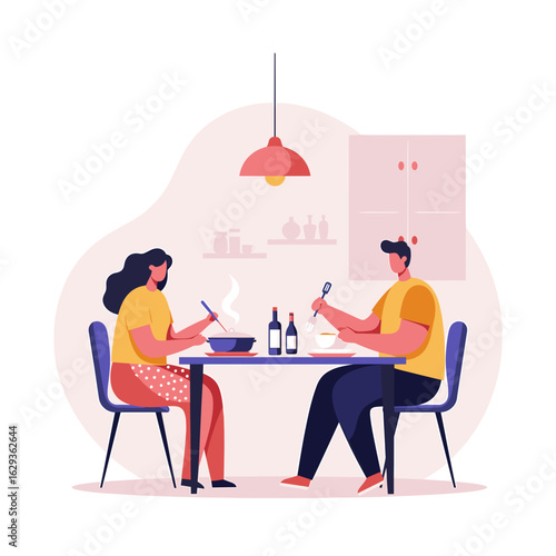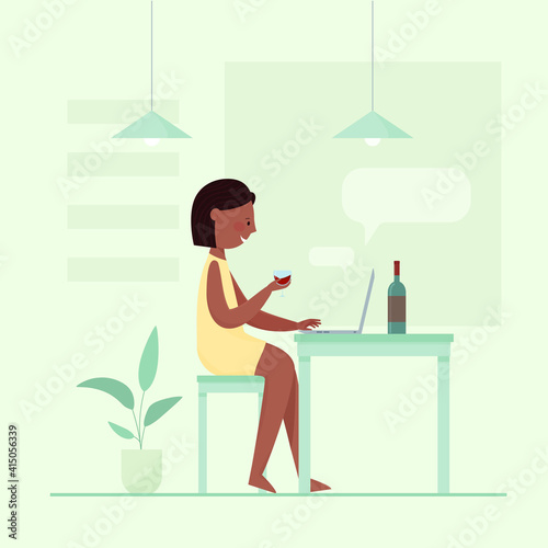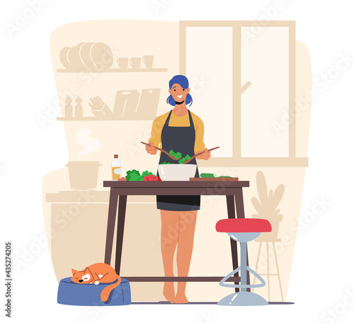Daily life. Young woman having breakfast at home, flat vector illustration. Happy girl sitting at table, eating, drinking coffee and using smartphone. Daily morning routine, everyday activities.