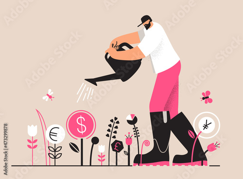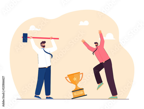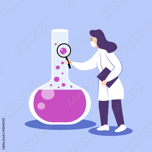 Huge organic cow milk bottle and glass, bowl of cottage cheese, micro male characters, vector illustration. Healthy milk and dairy products composition for web banner, website page etc.