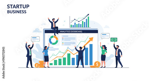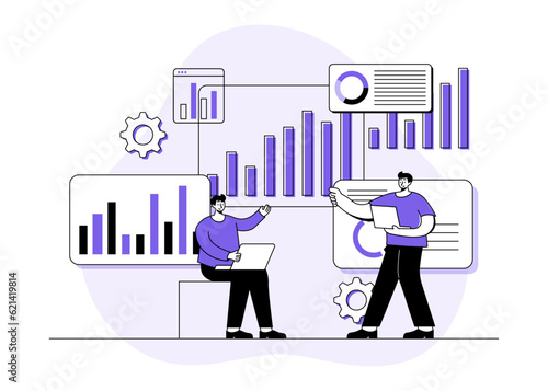 Data analysts, micro male and female characters analysing statistical data of analytics charts on tablet screen, vector flat style design illustration. Business analytics, financial data analysis.