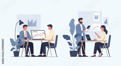 Data analysts, micro male and female characters analysing statistical data of analytics charts on tablet screen, vector flat style design illustration. Business analytics, financial data analysis.