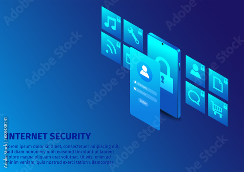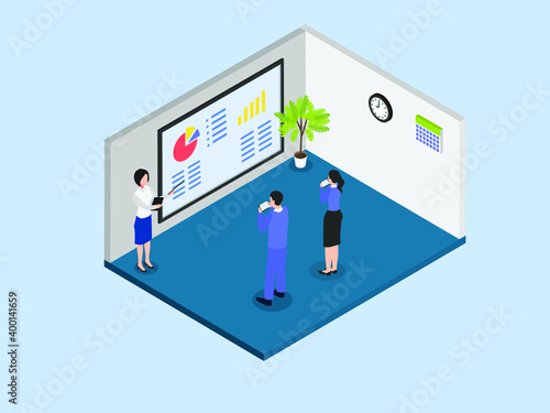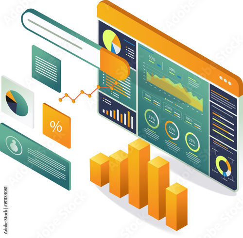 Data analytics concept. Vector isometric illustration of man looking at business statistics charts and graphs.