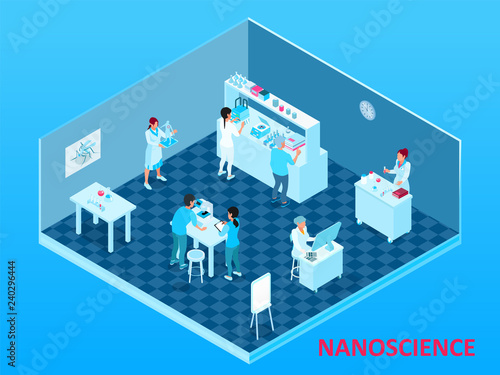 Data center cutaway interior vector flat isometric illustration with server rooms, server racks and personnel working there.