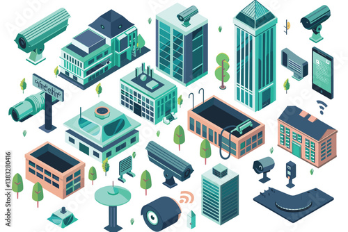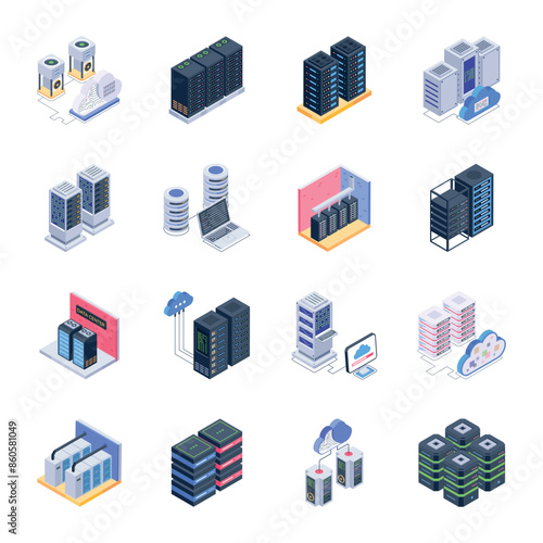 Data center isometric icon set, flat vector isolated illustration. Computer network equipment and staff. Server racks, operator, technician, engineer characters.