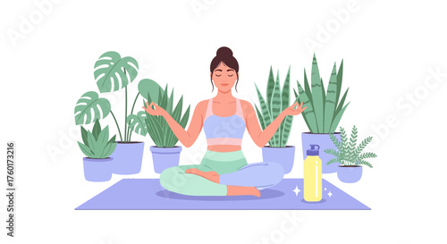 Vector illustration of redheaded woman in red swimming suit sitting on lounge chair. Girl using protective cream. Deckchair flat style design element.