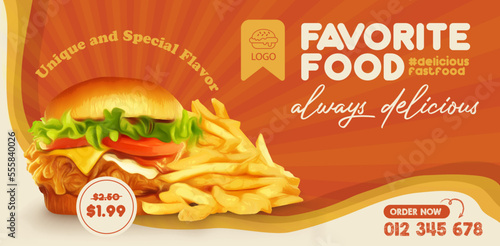 Delicious hot dog with ribbon and text, vector isolated illustration. Realistic hot dog bun with sausage, lettuce salad, tomato, cucumber, onion, ketchup and mustard. Fast food promo banners.