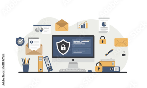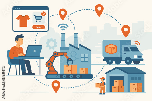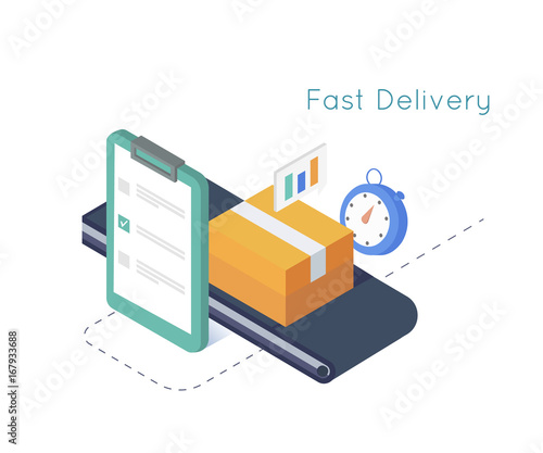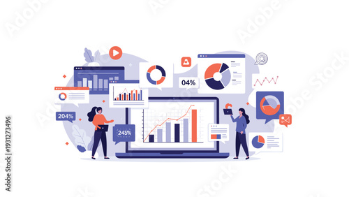 Vector illustration of warehouse, female sitting on delivery truck with bar diagram, parcels, statistics bar graphs and charts, paper plane. Worldwide delivery concept for web banner, website page etc