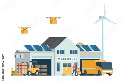Vector illustration of warehouse, delivery truck, parcels, worker, statistics bar graphs and charts. Delivery logistics shipping transportation concepts for web banner, website page, presentation etc.