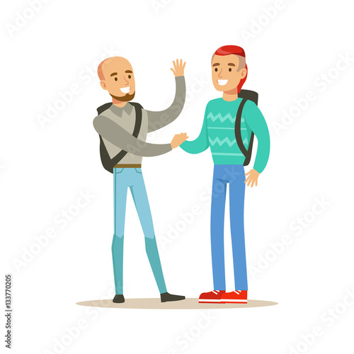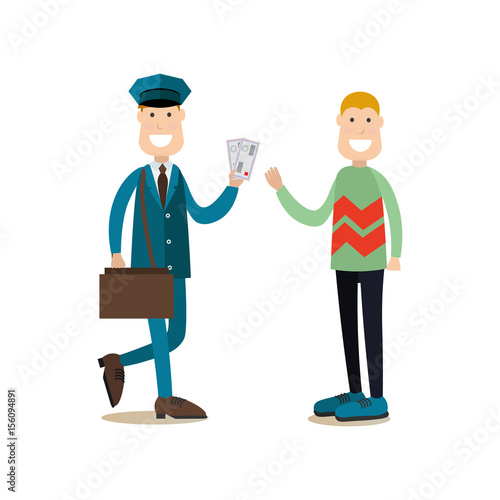 Vector illustration of postman delivering letters to receiver man. Delivery people concept flat style design element, icon isolated on white background.