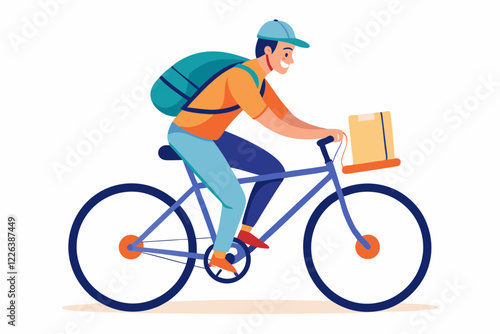 Vector illustration of postman riding bicycle and delivering mail. Cheerful smiling mailman with post bag. Delivery people concept flat style design element, icon isolated on white background.