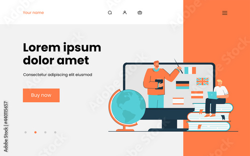 Delivery company landing page template. Vector illustration of warehouse, female sitting on delivery truck with bar diagram, parcels. Worldwide delivery concept for website, mobile site development.