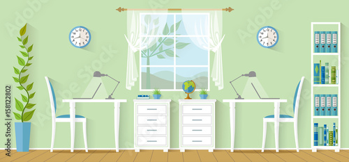 Dental clinic interior concept. Dentist works with patient vector poster.