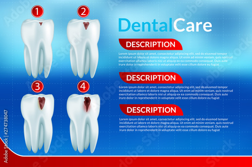 Dental treatment vector medical poster banner template. Realistic human teeth and dentist tools. Dental restoration or filling concept.