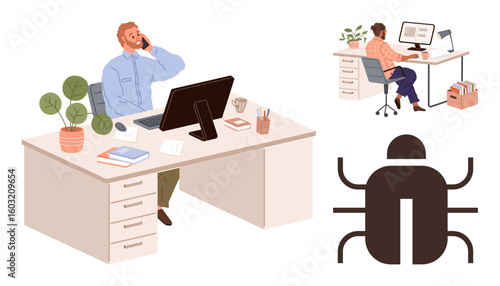 Depressed young man standing at office table full of folders and documents. Vector flat style design illustration. Overloaded, exhausted and stressed office worker because of doing paperwork.
