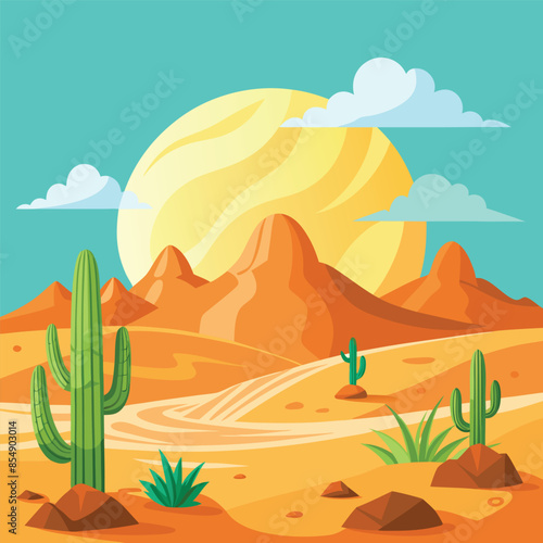 Desert landscape with cactuses and flying eagle. Vector illustration in paper art style.
