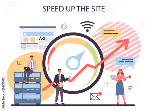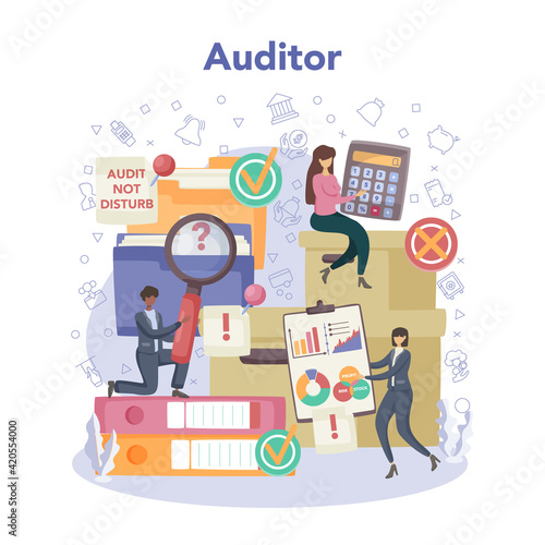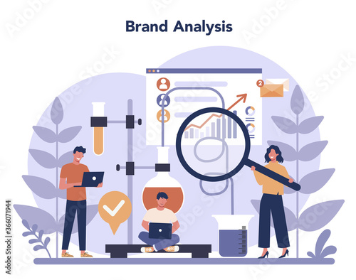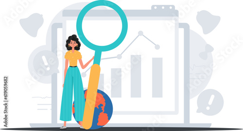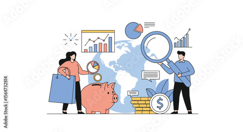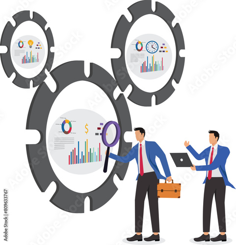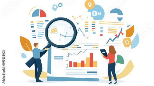Vector illustration of big magnifying glass and tiny private investigators holding magnifier, taking photo, looking through telescope, walking with dog. Detective services concept for web banner etc.