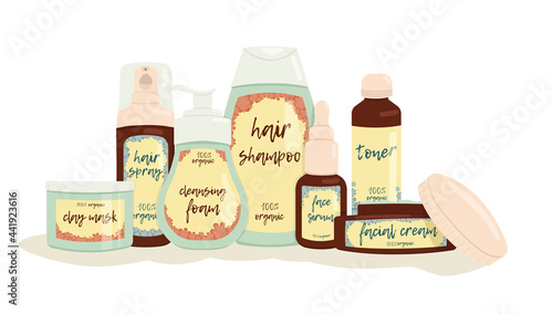 Body skin cosmetics vector. Eye gel, balm, sunscreen cream in bottles, tubes and jars illustration. Organic beauty product for skincare and hygiene. Promotion and advertising concept