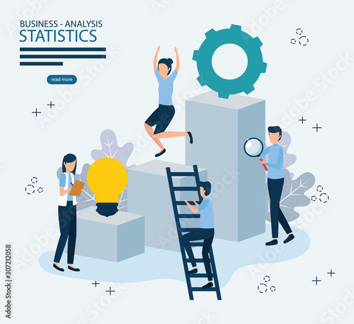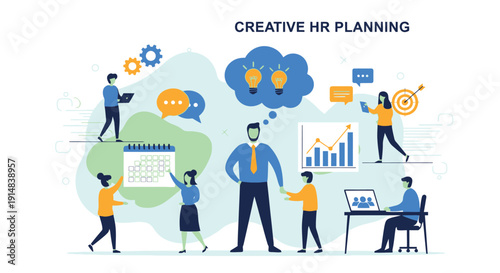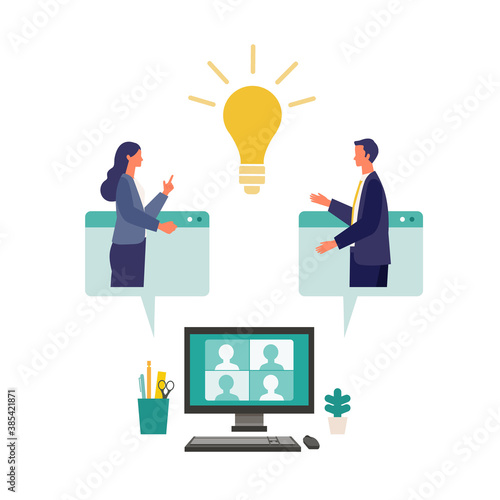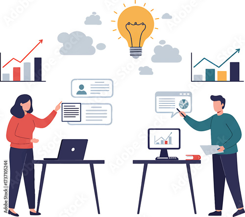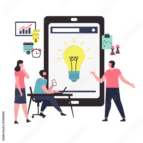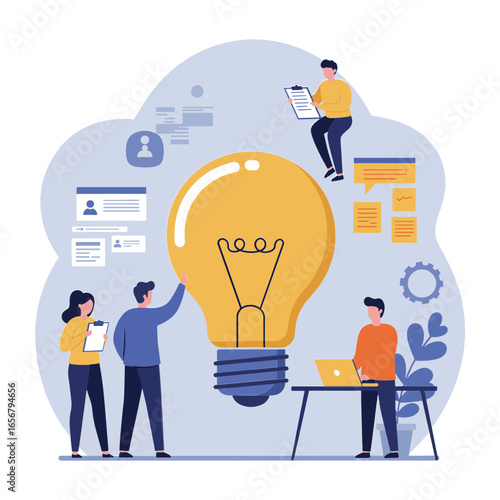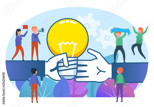 Marketing, vector flat illustration. Big light bulb creative idea and tiny people digital marketing professionals with megaphone, laptop. Business promotion and solution concept for web banner, etc.