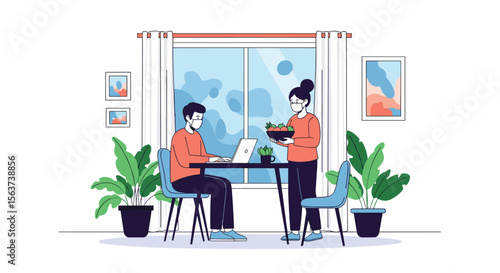 Dining room interior and girl eating while sitting at table by the window, vector flat illustration. Cozy woman room with furniture and decoration, modern home interior.