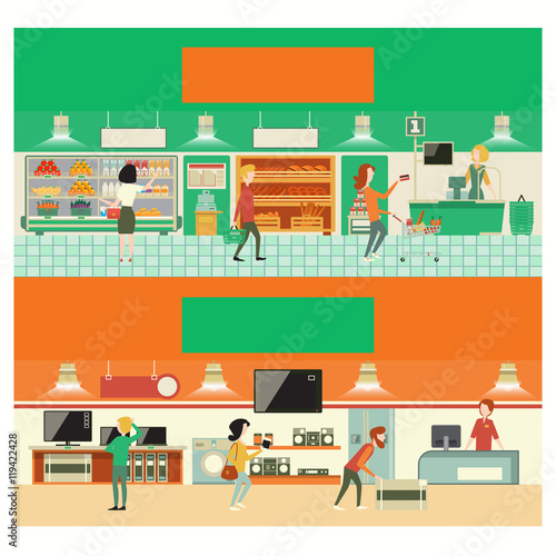 Vector restaurant interior set with receptionist, visitors having dinner, waiter and waitress taking order and serving meals. Flat style design illustration.