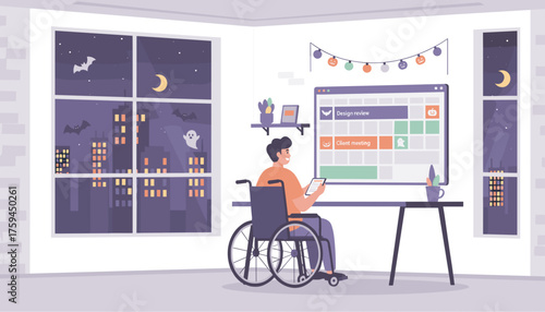 Disabled man on a wheelchair orders coffee in cafe. Accessible environment concept vector illustration. Handicapped man watching city life from window in cafe.