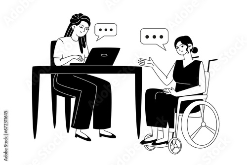 Disabled man using wheelchair working on laptop computer in office, flat vector illustration. Girl giving cup of coffee to handicapped business man. Disabled people lifestyles. Disability employment.