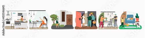Disabled senior man in wheelchair using staircase with accessibility ramp at house entrance, flat vector illustration. Wheelchair ramps for home accessibility. Disabled person lifestyle.
