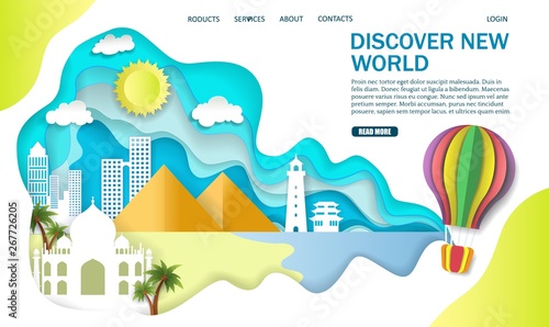 Discover new world vector website template, web page and landing page design for website and mobile site development. Paper cut hot air balloon, pyramids, other landmarks. Travel, adventure concept.