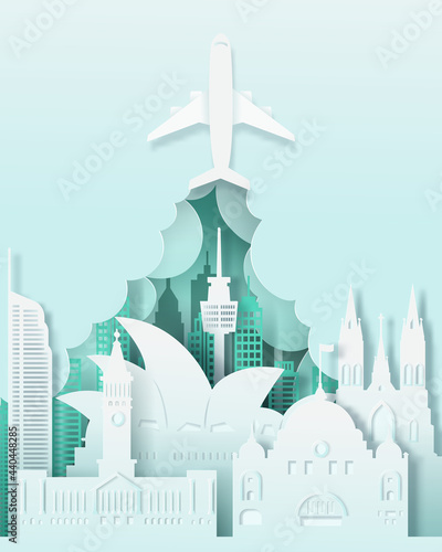 Discover new world web banner template. Vector layered paper cut style sky, airplane and world famous landmarks silhouettes. Worldwide tour, tourism, travel by air.