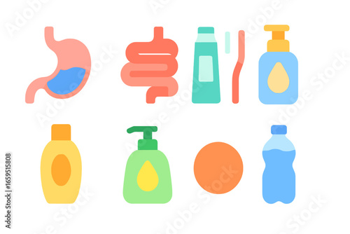 Dish wash liquid soap bottles vector set. Plastic packaging with gel cleaner, sponge and clean plate design. Branding and advertisement concept