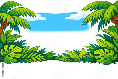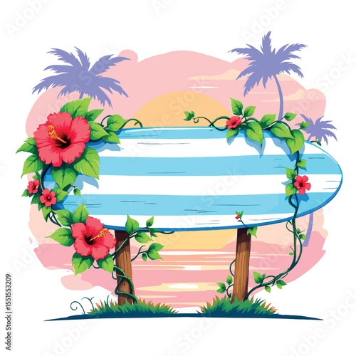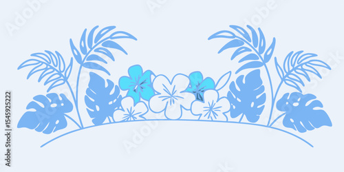 White round display podium, exotic flowers, bamboo, palm tree leaves, vector illustration. Tropical floral background for product advertising poster, banner, flyer etc.