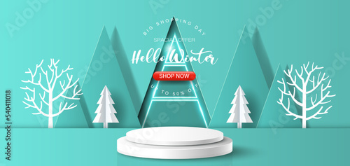 White round display podium mockup, paper cut winter forest landscape, vector illustration. Winter podium for gift, cosmetic product promotion. Season sales poster, banner template.