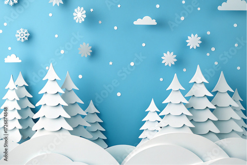 White round display podium mockup, paper cut winter forest landscape, vector illustration. Winter podium for gift, cosmetic product promotion. Season sales poster, banner template.