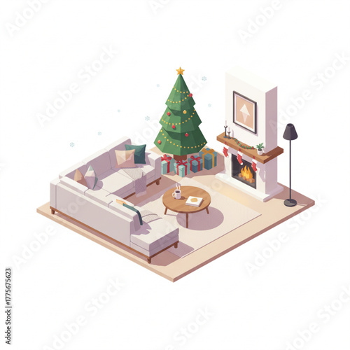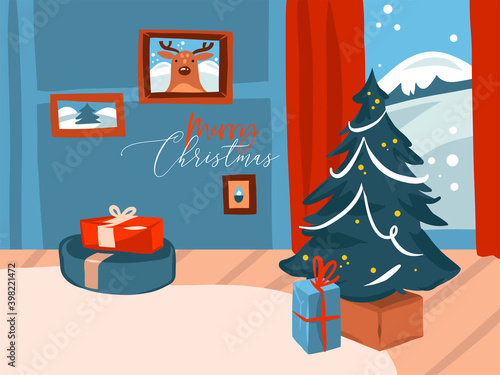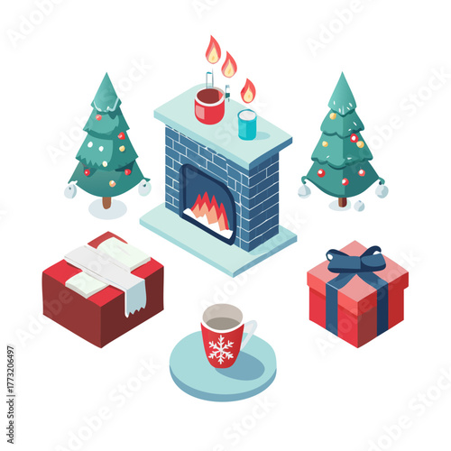 White display podium mockup set with gift boxes, paper cut Christmas tree, decorations, vector illustration. Christmas studio, platform, stand, stage for gift, cosmetic product promotion.