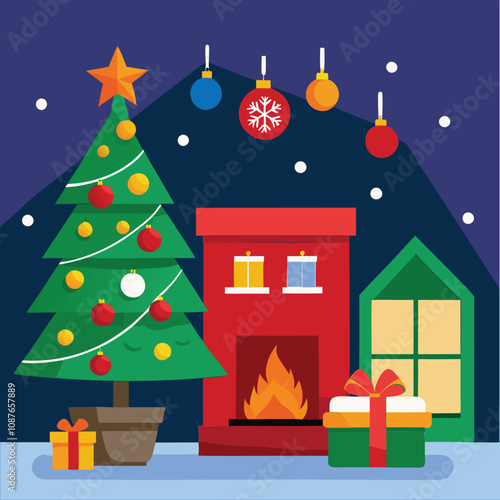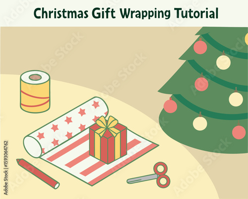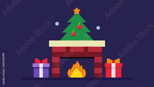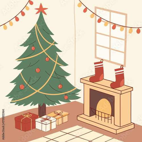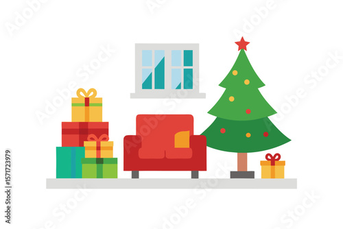 White display podium mockup set with gift boxes, paper cut Christmas tree, decorations, vector illustration. Christmas studio, platform, stand, stage for gift, cosmetic product promotion.