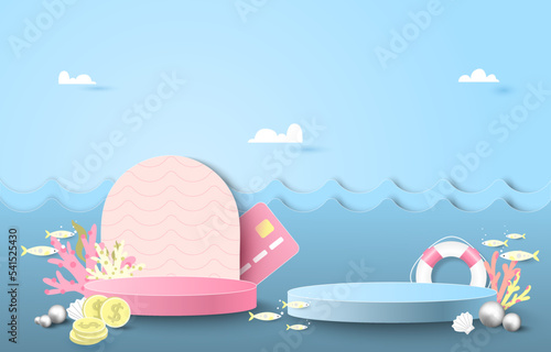 White round display podium, layered paper cut flowers, leaves, vector illustration. Floral background for product advertising poster, banner, flyer etc.