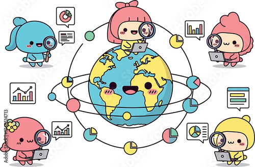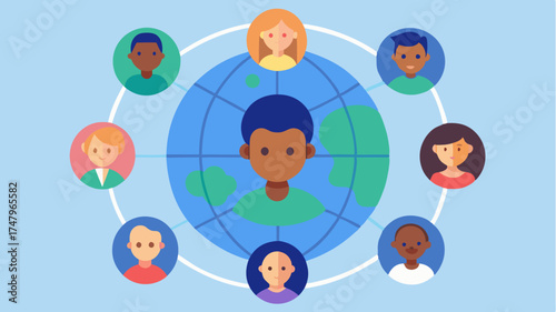 Outsourcing and worldwide connection concept. Distance learning or working around world vector. Student or employee team from different country online course or work remotely