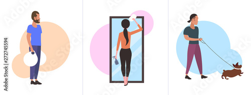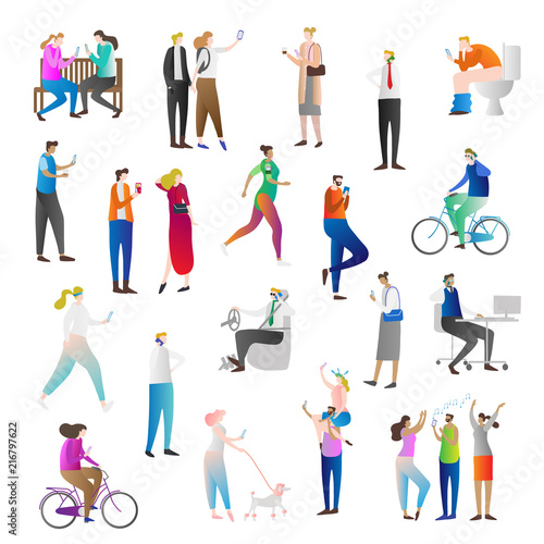 Diverse people sitting and standing going by public city transport flat vector illustration. Crowd of traveling passengers character inside train or metro subway interior