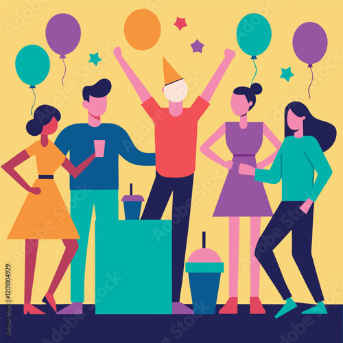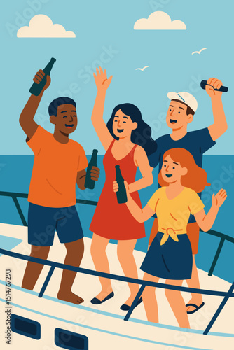 Dj prom party club vector background with happy people dancing illustration. Male disk jockey playing jockey mixing disco music tacks for clubbing group of man and woman