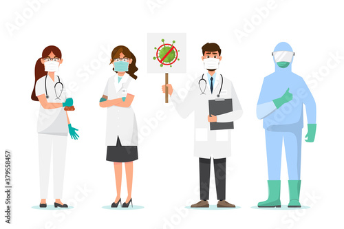 Doctor working online over world vector illustration. Worldwide healthcare medical service. Medic clinic staff wearing face mask standing over earth globe. Stop epidemic, save people live