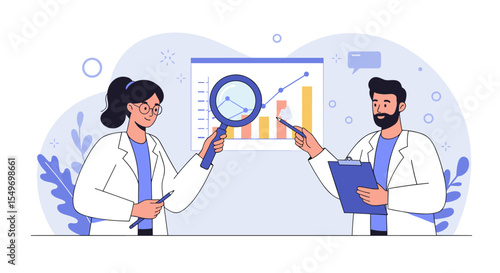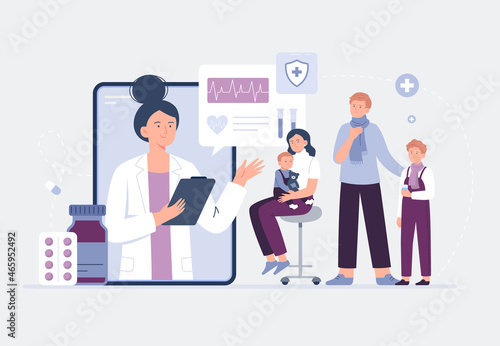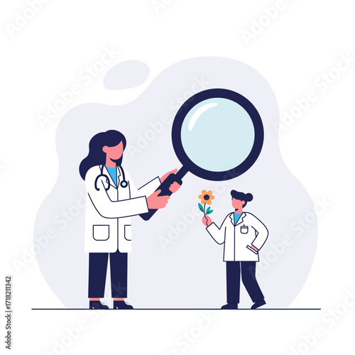 Female doctor cardiologist examining human heart with stethoscope, flat vector illustration. Cardiology, heart diseases, medicine and health care.