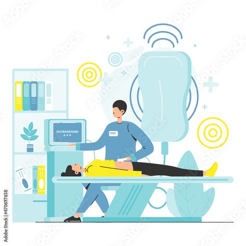 Doctor doing abdominal ultrasound diagnostics to female patient lying on medical bed, flat vector illustration. Ultrasound medical examination. Gastroenterology. Ultrasonography.